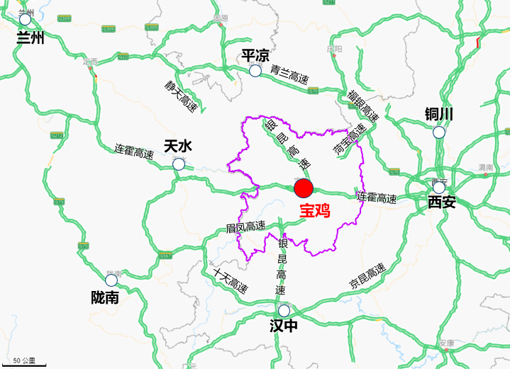 寶雞古稱陳倉(cāng),地處關(guān)中平原西部,是我國(guó)亞歐大陸橋上第三個(gè)大十字樞紐和全國(guó)性綜合交通樞紐城市之一。為發(fā)揮交通運(yùn)輸對(duì)寶雞經(jīng)濟(jì)和關(guān)中平原城市群發(fā)展的先導(dǎo)性和支撐作用,寶雞市政府出臺(tái)《關(guān)于加快構(gòu)建全國(guó)性綜合交通樞紐的意見》,提出到2025年末要建成“內(nèi)通外聯(lián),公鐵互補(bǔ)、空地立體、銜接順暢”的全國(guó)性綜合交通樞紐,市域范圍規(guī)劃形成“三橫兩縱兩環(huán)”高速公路網(wǎng)。