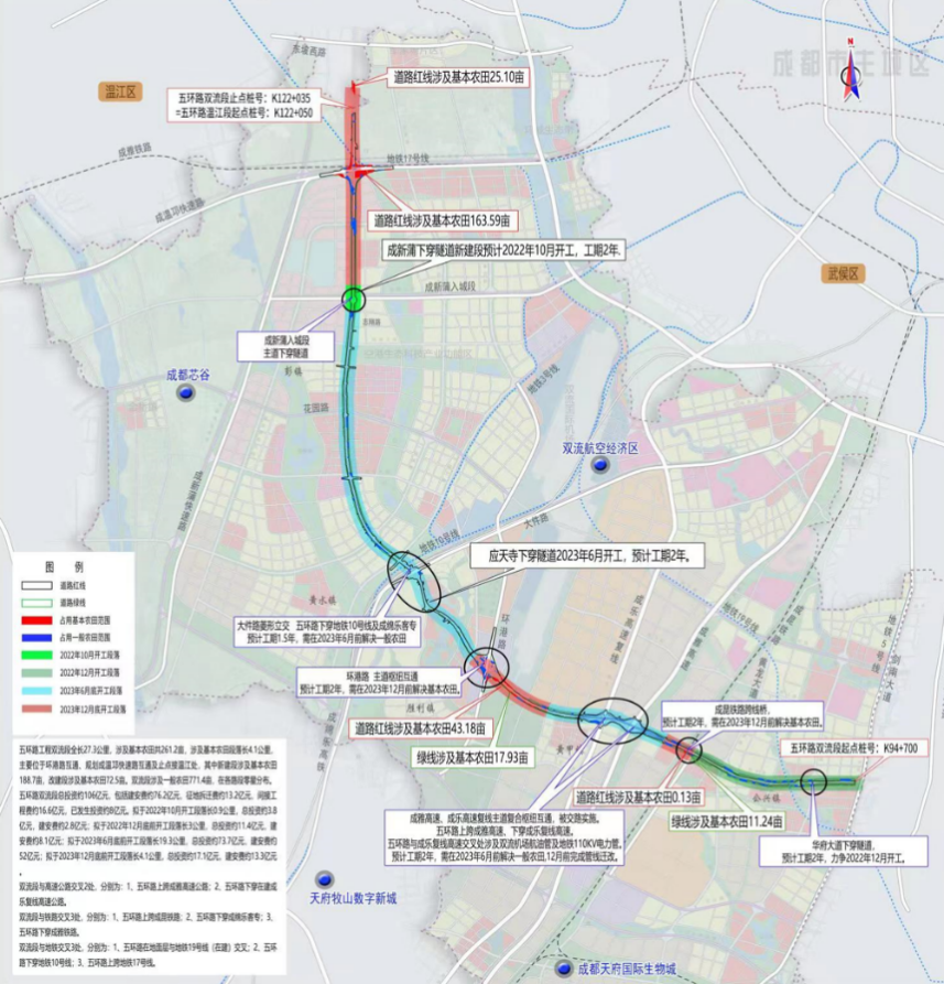 五環(huán)路位于成都市繞城高速、第二繞城高速之間,串聯(lián)龍泉驛區(qū)、天府新區(qū)、雙流區(qū)、溫江區(qū)、高新西區(qū)、郫都區(qū)、新都區(qū)、青白江8個區(qū)。五環(huán)路雙流段全長約27.335公里,全線建設(shè)采用一級公路兼城市配套標準,北至溫江界,南至劍南大道,建設(shè)內(nèi)容具體包括道路工程、橋涵工程、隧道工程、交叉工程、環(huán)保綠化、交安、機電、市政配套工程、景觀綠化等,主線設(shè)計速度 80Km/h。本項目估算總投資約92.82億元。