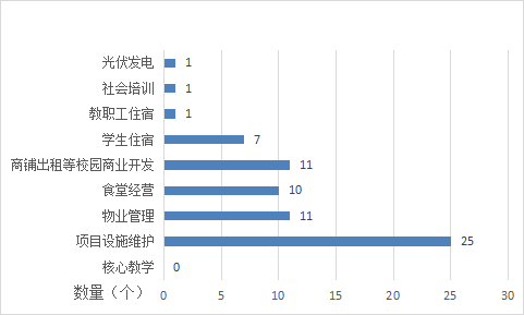 按照項(xiàng)目公司運(yùn)營(yíng)內(nèi)容是否包含教學(xué)內(nèi)容等核心業(yè)務(wù),公立高等學(xué)校PPP項(xiàng)目可以分為兩類。實(shí)踐中,由于高校教學(xué)任務(wù)的特殊性、專業(yè)性以及教育領(lǐng)域企業(yè)傾向于輕資產(chǎn)運(yùn)營(yíng)等原因,較多公立高等學(xué)校PPP項(xiàng)目核心教學(xué)任務(wù)由學(xué)校開(kāi)展,非核心教學(xué)內(nèi)容交由項(xiàng)目公司負(fù)責(zé)。全國(guó)PPP綜合信息平臺(tái)管理庫(kù)顯示共有25個(gè)高等學(xué)校PPP項(xiàng)目進(jìn)入執(zhí)行階段并滿6個(gè)月(此時(shí)可對(duì)外公示項(xiàng)目實(shí)施方案等信息),其項(xiàng)目運(yùn)營(yíng)維護(hù)內(nèi)容集中于項(xiàng)目設(shè)施維護(hù)、物業(yè)管理、食堂經(jīng)營(yíng)、學(xué)生住宿和商鋪出租等商業(yè)開(kāi)發(fā)。