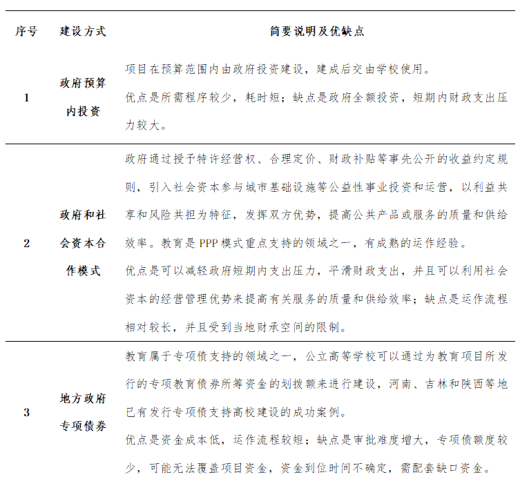 根據(jù)《政府投資條例》、《防范和化解地方政府隱性債務(wù)風(fēng)險(xiǎn)的意見(jiàn)》(中發(fā)〔2018〕27號(hào))等法規(guī)政策精神,目前公立高等學(xué)校主要有以下幾種建設(shè)方式:
