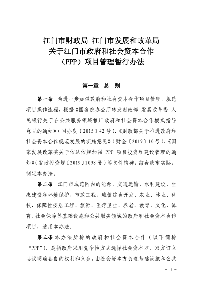 為進(jìn)一步加強(qiáng)江門市政府和社會(huì)資本合作(PPP)項(xiàng)目管理,規(guī)范項(xiàng)目操作流程,江門市財(cái)政局聯(lián)合江門市發(fā)展和改革局制定出臺(tái)了《江門市政府和社會(huì)資本合作(PPP)項(xiàng)目管理暫行辦法》(江財(cái)規(guī)〔2022〕1號(hào))(以下簡(jiǎn)稱《暫行辦法》),并于2022年4月經(jīng)江門市人民政府同意正式印發(fā)。